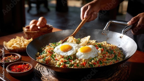 An Indonesian chef stir-frying nasi goreng with sizzling eggs and crispy kerupuk on a traditional wok