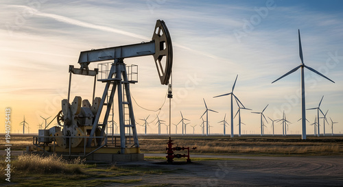 An industrial oil pump jack stands as a silhouette against a dramatic sunset sky, representing the power of petroleum exploration and energy drilling in a Texas oilfield