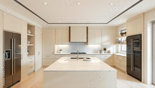 an Interior of a kitchen in modern beige and soft cream style, island top with marble.