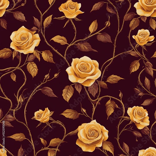 An intricate design of golden roses intertwined with vines, seamlessly repeating over a rich burgundy background, exuding vintage charm