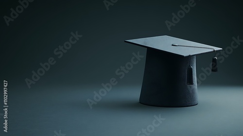An intricate photorealistic shot of a graduation cap floating in the air, isolated against a dark plain backdrop.