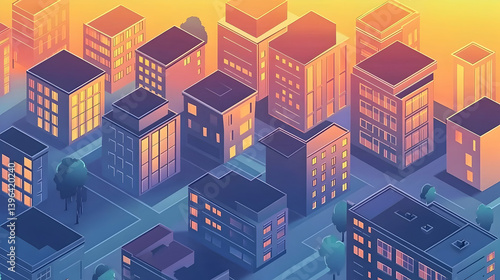 An isometric illustration of a vibrant urban cityscape at dawn or dusk.
