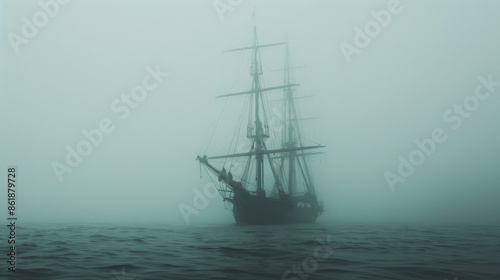 An old sailing ship emerges from dense fog on a calm, misty sea, creating an eerie and mysterious atmosphere under a muted, gray sky.