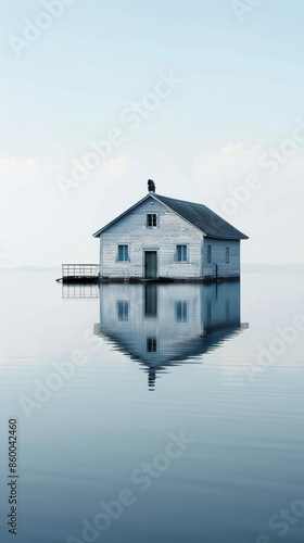 an old white house with a dark roof on the lake. The house is reflected in calm water, cold lighting, bright blue sky