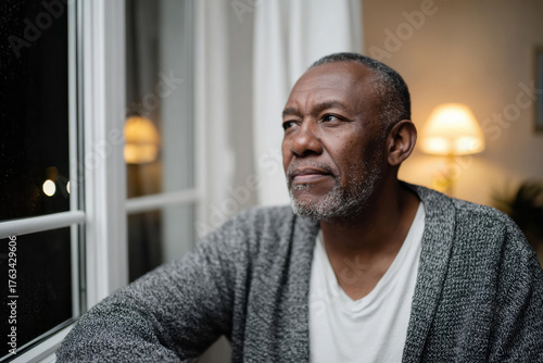 man, window, home, rain, thought, emotion, pensive, night, thoughtful, wisdom, life events, intimacy, mature, calmness, solitude, personal, ambience, quiet, atmosphere, rich, natural light, deep, exploration, age, lifestyle, indoor, cosy, serene, gentle, water droplets, soft light, connection, depth, mindful, journey, nostalgia, warmth