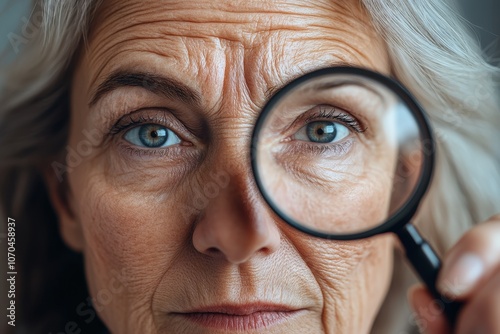 senior, woman, magnifying, glasses, skincare, introspection, wrinkle, grey, hair, facial, aged, skin, indoor, space, daytime, elderly, examining, detail, beauty, health, personal, care, curiosity, thoughtful, ageing, clear, eye, expressive, face, conversation, cosmetic, eye, magnifier, looking, lens, detective, person, magnifying glass, search, magnifying glass, business, look, people, magnify, hand, through, goggles, discovery