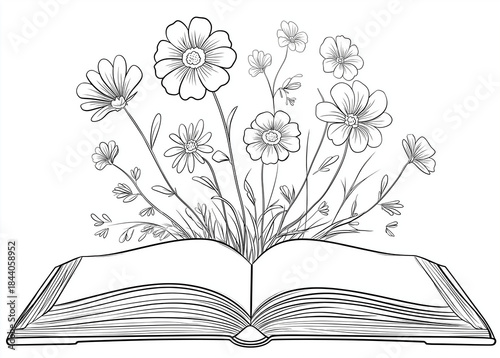 an open book with flowers growing out of it, a simple line art vector drawing in black and white