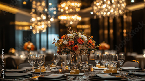 An opulent event space set for a high-end function, with beautifully arranged tables, elegant centerpieces, and ambient lighting.