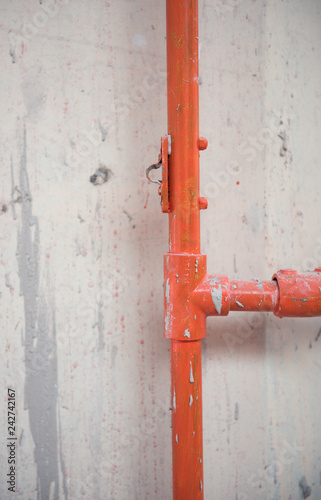 An orange Industrial metal water pipe a cold hard industrial factory setting. Metal iron pipes being used for liquid transportation. Artistically composed photographed straight on.