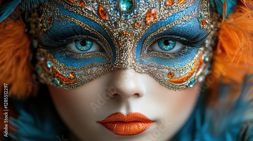 An ornate Venetian carnival mask is adorned with colorful feathers and sparkling jewels, exuding mystery and elegance