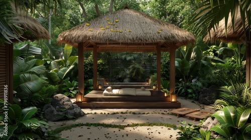 An outdoor Thai massage pavilion set against a backdrop of tropical foliage, providing guests with a serene space for traditional healing therapies.