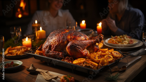 An oven-roasted turkey with potatoes, served for a family gathering