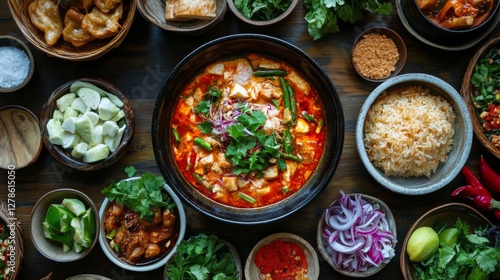 An overhead shot of a bowl of hot on a dining table, surrounded by traditional Thai side dishes and condiments, creating a vibrant and inviting meal spread.