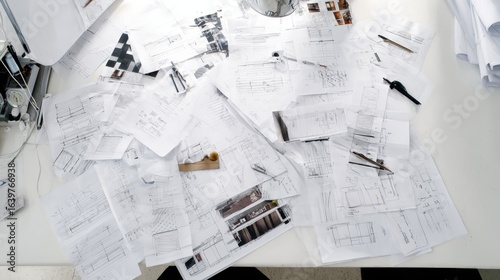 An overhead view of a creative workspace with abstract sketches, reflecting innovation and thoughtful planning.