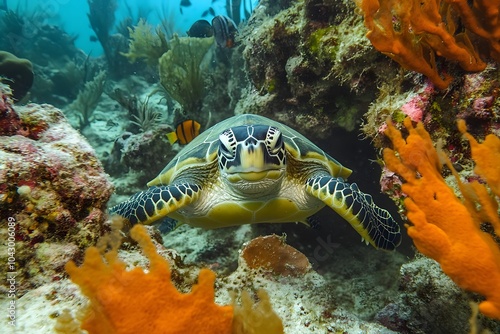 An underwater photo of a playful sea turtle swimming through a vibrant coral reef, surrounded by colorful fish and plants.