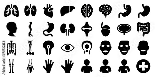 anatomy, glyphs, icon, set, body, organ, skeleton, spine, eye, ear, nose, mouth, lip, hand, foot, hand, foot, stomach, kidney, bladder, bone, skull, rib, nubes, brain, liver, lung, bowel, pelvis, joint, vector, silhouette, black, medicals, health care, human, system, internal, organ, bone, diagram, biology, science, structure, physiology, medicine, health, illustration