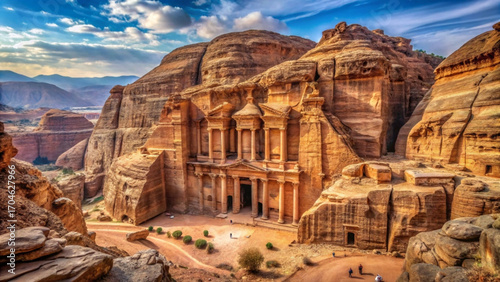 ancient, city, carved, rock, face, blue, sky, petra, jordan, historical, site, architecture, tour tourism, travel, destination, sandstone, cliff, historical building, entrance, temple, ruin, culture, heritage, landscape, desert, sunlight, shadow, holiday maker, exploration, adventure, middle, east, artifact, history, civilisation, scenery, natural