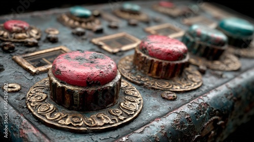 grunge, texture, panel, control, buttons, knob, ancient, antique, mystical, magic, weathered, rust-eaten, aged, brass, metal, turquoise, red, pink, detail, closeup, background, retro, vintage, technology, science fiction, fantasy, interface, industrial, machinery, mechanism, ornate, decorative, pattern, design, element, digital artwork, illustration, abstract