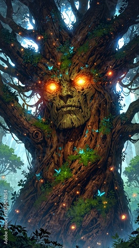 tree, forest, fantasy, mythical, creature, magical, nature, spirit, ancient, wood, entity, artwork, illustration, digital, painting, glowing, eye, face, leaf, branch, bark, root, butterfly, light, dark, green, brown, mystical, enigmatic, powerful, serene, whimsical, dreamlike, enchanted, mysterious, awe, wonder, art