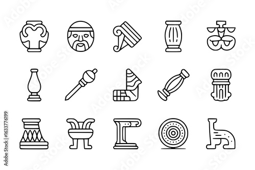 Ancient Greek history icon set: Amphora, philosopher, architectural elements, columns, furniture, shield, sculpture. Minimalist black and white vector line art illustrations. Educational and decorativ