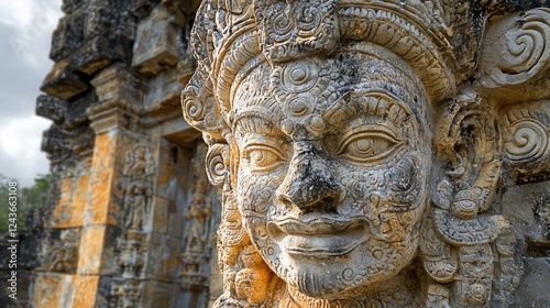 Ancient Indonesian stone carving face, temple ruins background, detailed close-up
