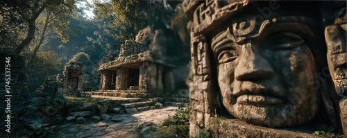 Ancient overgrown mayan temple ruins in jungle concept. Ancient stone faces in a lush jungle setting, revealing history.