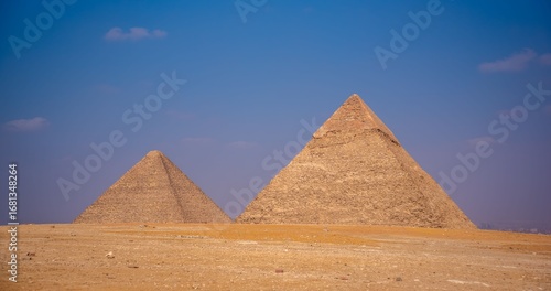 Ancient pyramids under a clear blue sky in Giza, Egypt