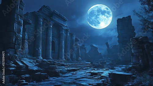 ruin, ancient, moonlight, column, stone, night, moon, blue, light, path, architecture, history, travel, fantasy, mystery, traveler, building, masonry, landscape, dark, nature, exterior, historical, evening, classic, ruin, paseo, pathway