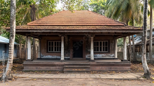 ancient, house, exterior, pillar, rustic, old, building, architecture, vintage, tropical, palm tree, front view, entrance, step, door, window, wall, aged, weathered, decayed, abandoned, historical, heritage, traditional, rural, landscape, nature, brown, red, stone, wood, leaf, ground, daytime, sunny, home, structure, design