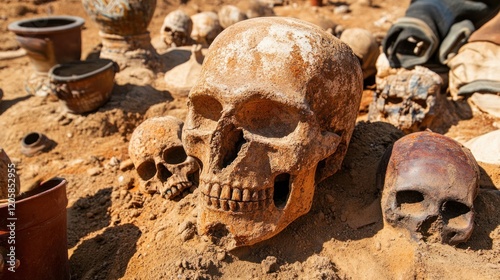 Ancient skulls unearthed, pottery fragments, archaeological dig site, sunny day, historical research