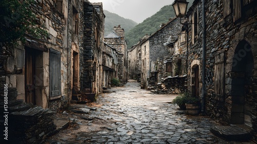 Ancient stone buildings line a narrow, cobblestone street winding through a historic European village nestled against misty mountains.