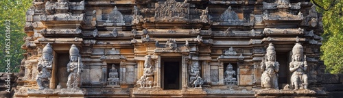 Ancient temple facade with intricate carvings and sculptures, showcasing cultural heritage.