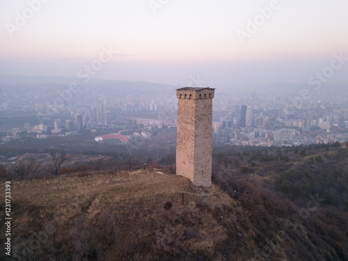 Ancient tower opposite city skyscrapers in Georgia - aerial view