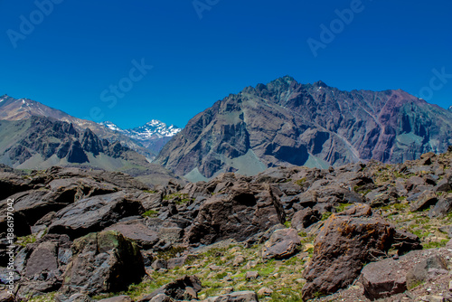 Andes mountains beautiful landscape in early spring with melting snow on the mountain slopes and lakes. Volcano San Jose in the high altitude Andes in Santiago de Chile area