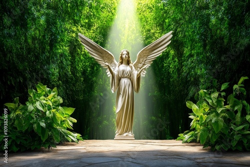 angel, ascending, through, beam, light, dark, forest, creating, aethereal, hopeful, ambience