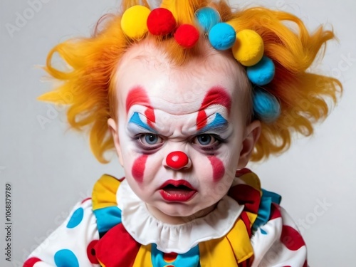 angry, baby, clown, white, background, funny, face, costume, circus, children, make-up, make-up, colourful, fun, wig, doll, eye, design, red nose, birthday, hair, illustration