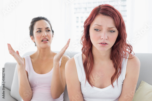 20s, young adult, woman, female, caucasian, indoor, looking away, home, house, apartment, couch, sofa, living room, brown hair, sitting, human relationships, together, argument, challenged, disagreement, angry, unhappiness, unhappy, upset, rift, problem, trouble, fight, arguing, fighting, annoyed, beautiful, casual attire, conflict, crisis, serious, leisure, lifestyle, relaxation, brunette, pretty, attractive, friends, friendship, slumber party, gesticulate, listening