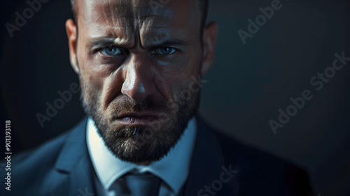 Angry looking businessman working in the office, stressed adult at work