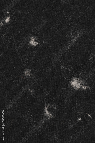 Animal white wool on black clothes background texture. close up of cat hair on clothes