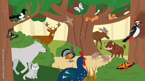 Animals in the forest. Vector illustration in flat cartoon style.