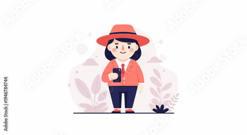 illustration, character, woman, person, animated, graphic, flat, design, cute, smiling, hat, coral, jacket, attaching, shirt, pant, shoe, mobile, phone, holding, hand, digital, technology, communication, connection, social, media, online, browsing, app, background, foliage, leaf, plant, organic, soft, subtile, pastel, pink, white, modern, style, minimalist, creative, icon, simple, vector
