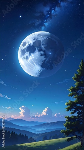 moon, sky, night, star, cloud, landscape, mountain, tree, forest, nature, blue, glow, light, dark, serene, peaceful, calm, scenic, view, distant, field, grass, silhouette, hill, vale, anime, illustration, artwork, digital, fantasy, cosmos, universe, aethereal, magical, cosmic, bright, celestial, atmosphere, tranquil, twilight, evening, outdoors, horizon, background, wallpaper