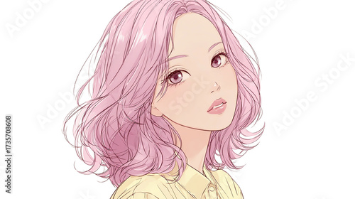 anime, girl, pink, hair, illustration, female, character, portrait, young, looking, beautiful, pretty, face, skin, style, art, digital, render, cartoon, woman, eye, light, short, design, background, beauty, head, head shot, cut-out, isolated, person, graphic, drawing, pose, smile, happy, model, shirt, shoulder, pale, colours, calm, cute, manga, aesthetic