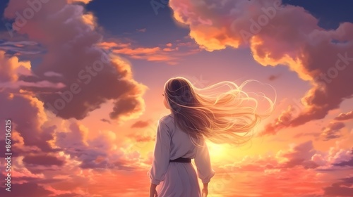 anime, girl, cloud, hair, sunset, sky, vibrant, serene, cartoon, fantasy, dream, woman, beauty, nature, landscape, silhouette, glow, light, peaceful, elegant, dramatic, atmosphere, scenery, mystical, spiritual, aethereal, whimsical, magical, daydream, escapism