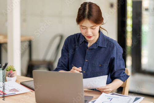 Annual, summary report, laptop and paper placed at office desk. Asian woman work online and plan financial data with laptop, work in the office. Business woman and planner concept