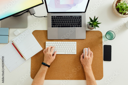 up high, home, business, tied-up, mobile phone, closeup, computer, desk, device, electronic, from above, guy, home, home office, houseplant, indoor, inside, keyboard, laptop, male, man, mobile phone, mouse, phone, portrait, potted plants, room, tech, technology, phone, work, working
