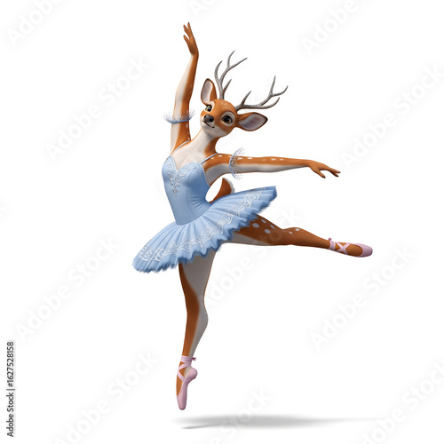 Anthropomorphic deer ballerina performing a graceful ballet pose isolated on white background