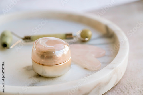 Anti-Age Eye Cream and Gua Sha Stone in a marble plate