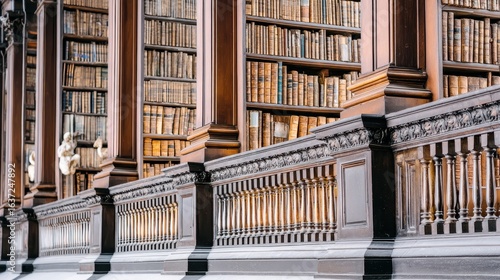 library, book, bookshelf, wood, antique, balcony, balustrade, ornate, aged, scholarly, tranquil, atmosphere, reading, cognition, education, history, culture, vintage, classic, old book, research, study, learning, wisdom, literature, architecture, interior, building, design, detail, texture, pattern, shadow, light, dark, contrast, brown, black, white, stone