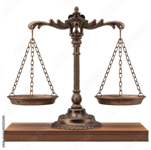 Antique brass weighing scale on a wooden surface symbolizing justice and balance in legal contexts. cut out. PNG. transparent background.